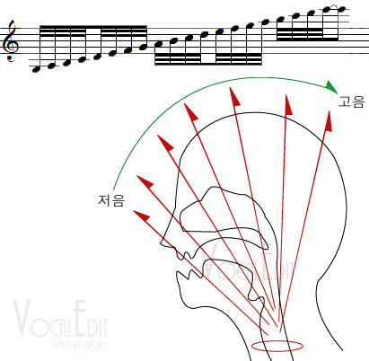 고음의 경우 위의 그림에서 보듯 두성부를 울려야 제대로된 고음을 낼수가 있게 되는데, 이때에는 특히 앞서 말했듯 두성부의 울림점을 얼마나 잘 알고 있는냐와 그곳에 호흡을 얼마나 정확하게 전달하냐에 따라서 고음을 말그대로 잘, 제대로 낼수 있느냐가 결정됩니다.