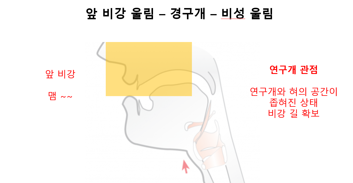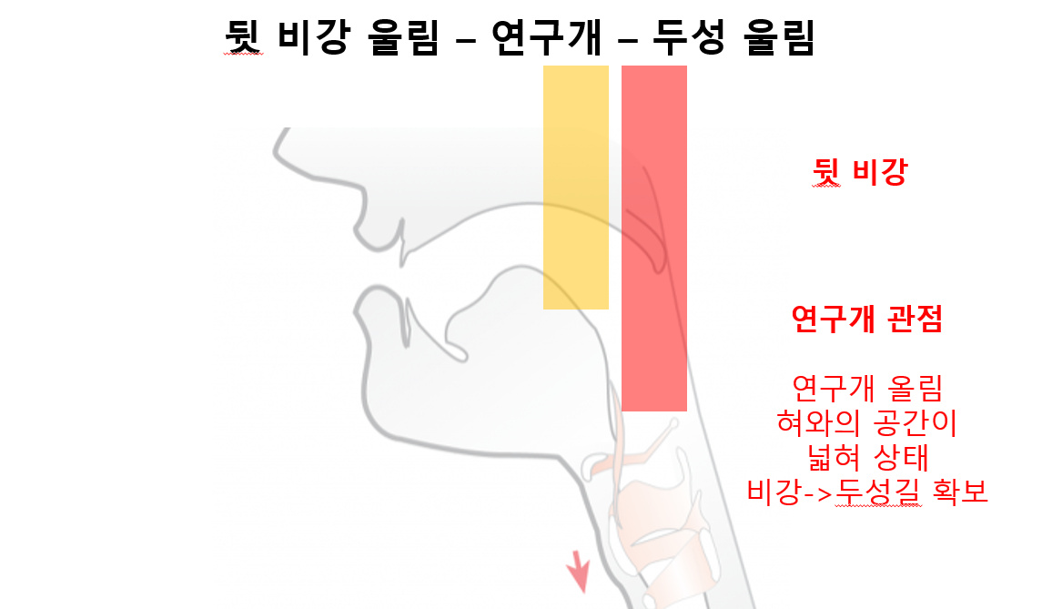 연구개 관점으로 연구개와 협의 공간이 좁혀지면 비강길이 확보된 상태가 되며