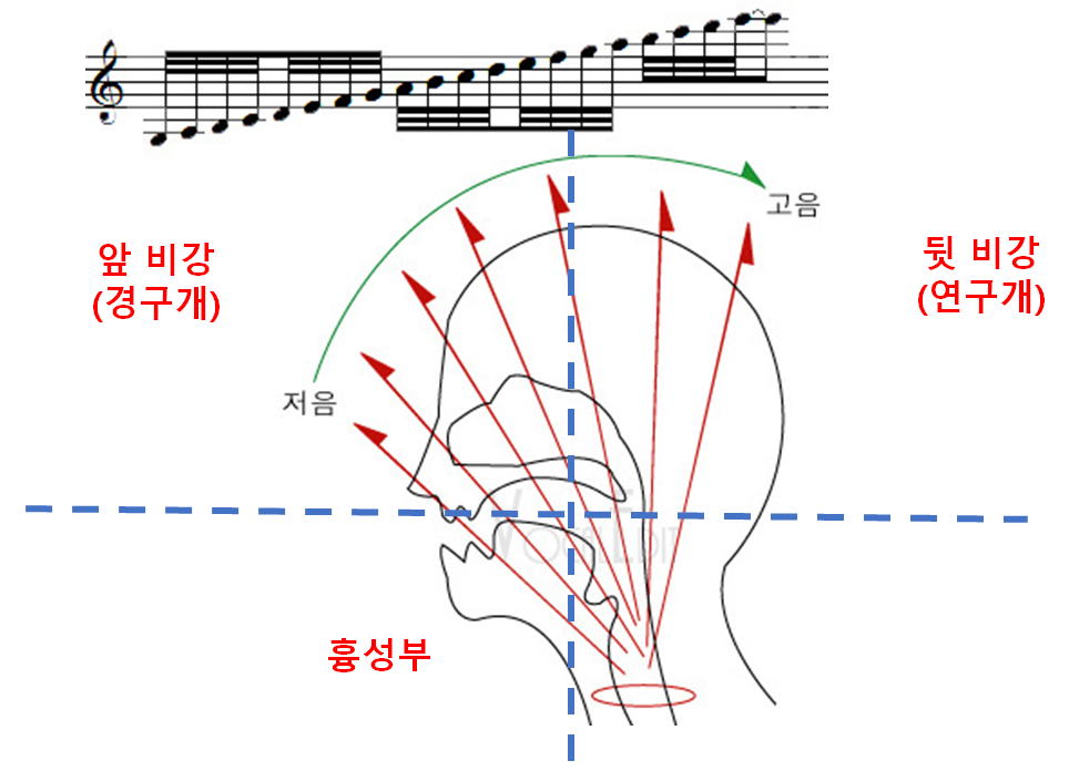 5. 후두 올림 + 연구개를 들어 소리를 부드럽게(연구개, 경구개간의 울림 조정으로 부드러움 만듦)