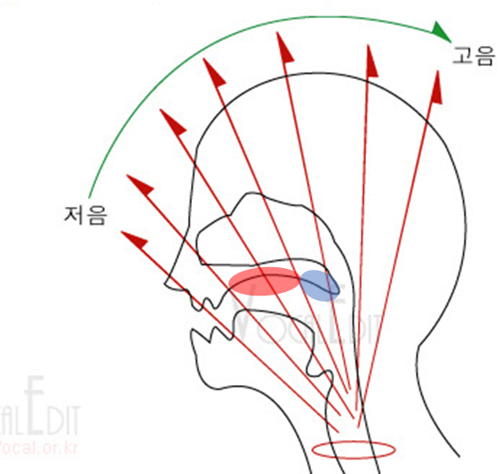 - 후설을 내리고(후두 내려짐) 연구개 들면 부드러운 고음
