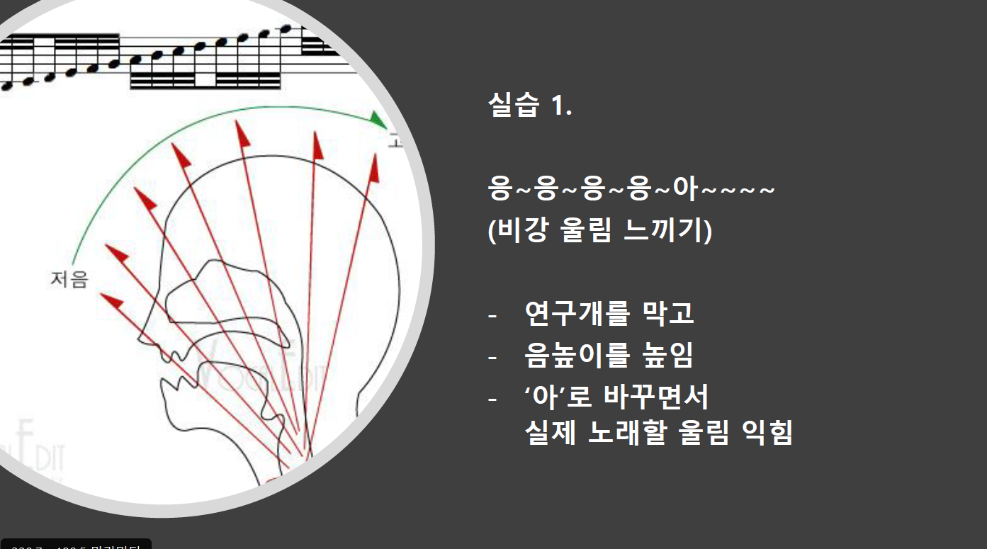 아 ~~~~ 를 한 번에 비강의 울림에 내는 연습입니다. 비강 울림을 충분히 느꼈다는 전제 하에